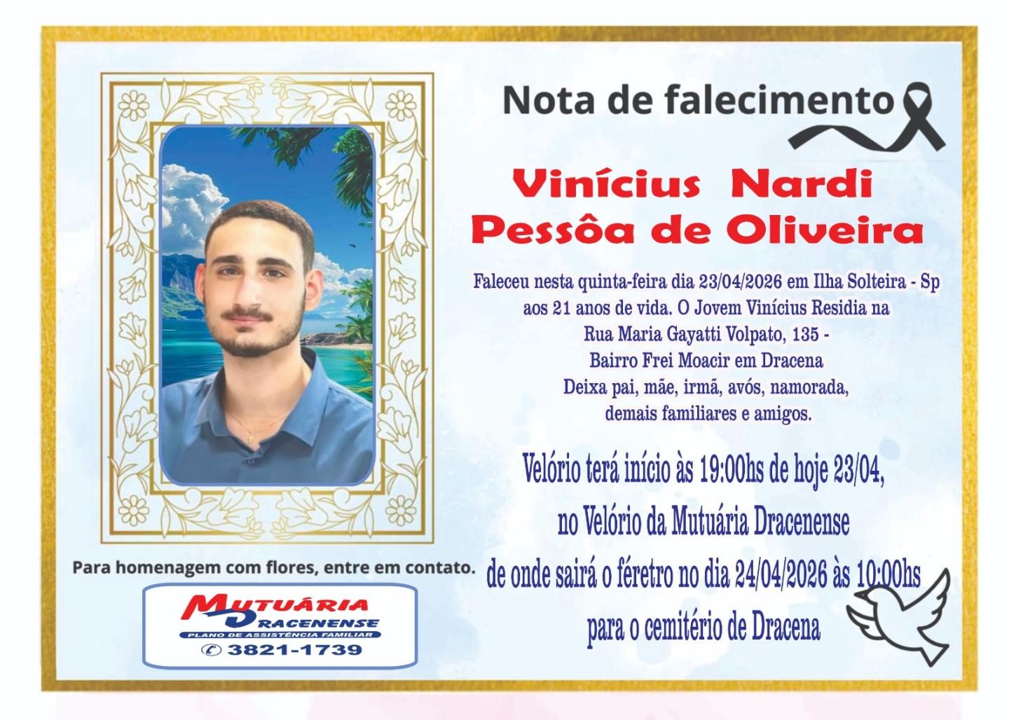 De acordo com informações repassadas por profissionais da imprensa regional, incluindo a TV Oeste Paulista e o site Jorge Zanoni, da cidade de Dracena, o jovem Vinícius Nardi Pessôa de Oliveira, de 21 anos, que morreu na madrugada desta quinta-feira (23), após um capotamento na Avenida Brasil Sul, em Ilha Solteira, teve o início do seu velório na noite desta quinta-feira, às 19h, no Velório da Mutuária Dracenense. O sepultamento está marcado para esta sexta-feira (24), às 10h, no cemitério de Dracena.