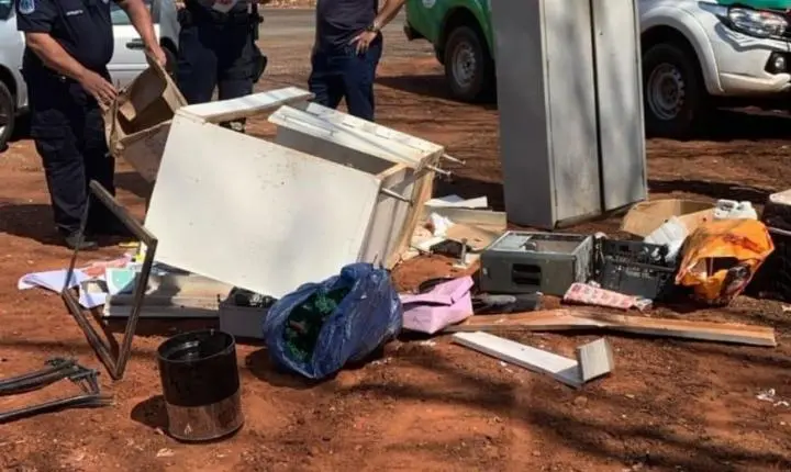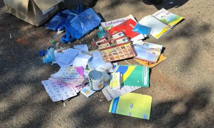 Ao inspecionar o material, os agentes constataram que se tratava de material escolar, incluindo caixas de papelão, livros, cadernos, atividades escolares e outros itens relacionados, conforme registrado em imagens.