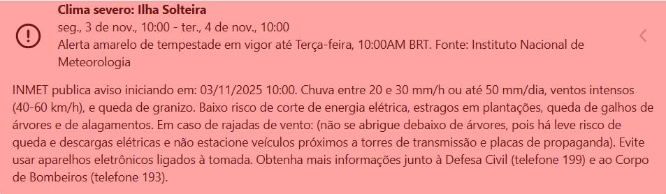 Terça-feira (04/11): O cenário se repete com chuvas frequentes e eventual tempestade, máxima de aproximadamente 34 °C, mínima de 23 °C. Ainda sob efeito de alerta de tempestade.